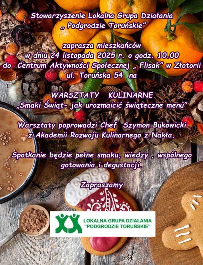 Warsztaty odbędą się 24 listopada 2025r. w godzinach 10.00 w Centrum Aktywności Społecznej ,,Flisak" w Złotorii (ul. Toruńska 54, Złotoria)